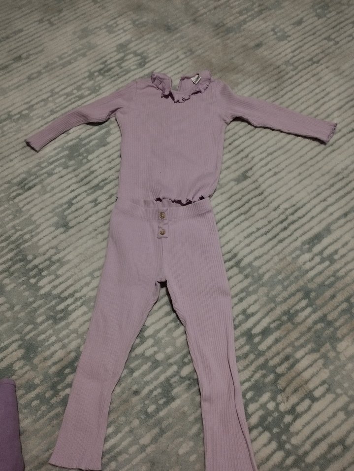 Pastel mor renkte, uzun kollu ve düğmeli bebek kız takımı. Yumuşak ve rahat kumaştan, desensiz sade tasarım.temiz kullanılmış fitilli takım bir sorunu yok markası LCW . #lcw #defacto #hm #koton #zara #çocuk