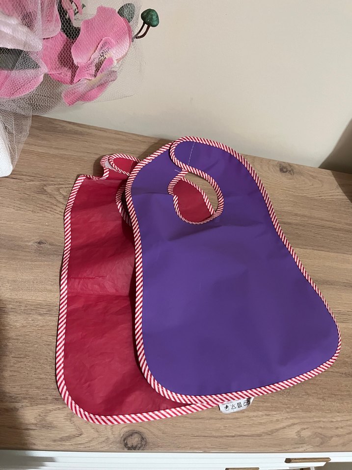Mor ve pembe renklerde, çizgili kenarlara sahip, kolay giyilen 2'li bebek mama önlüğü seti.