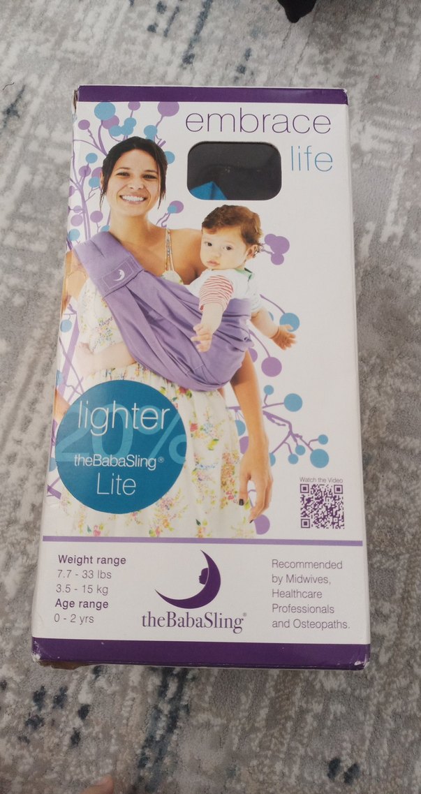 0-2 yaş arası bebekler için 3,5-15 kg taşıma kapasitesine sahip mor renkli hafif sling. Ebe, sağlık profesyonelleri ve osteopatlar tarafından önerilir. kullanılmadı.