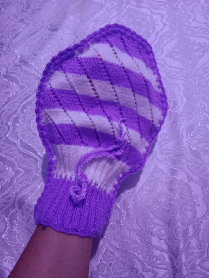 Mor ve beyaz pastel bağlama desenli, örgü kız eldivenleri; bilekte lastikli ve parmak halkalı tasarım içerir.