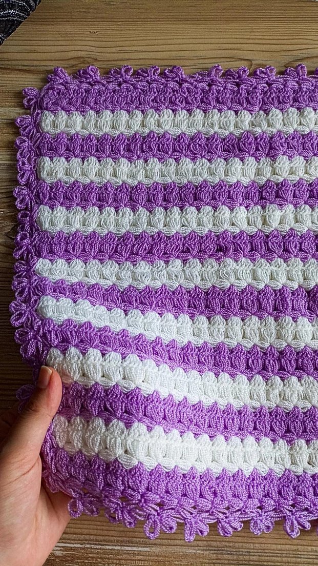 Mor ve beyaz renklerde çizgili, dokulu tasarıma sahip renkli banyo süngeri. el emeği marka temsili