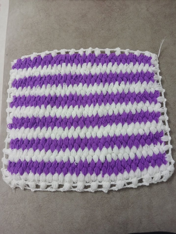 Mor ve beyaz çizgili, dokulu ve yumuşak malzemeden yapılmış renkli bir banyo süngeridir. ilif