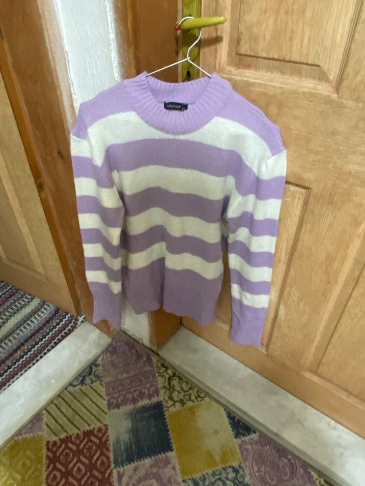 Mor ve beyaz çizgili, uzun kollu, rahat kesim kadın triko kazak. Yumuşak örme kumaştan, günlük ve sokak stiline uygun.