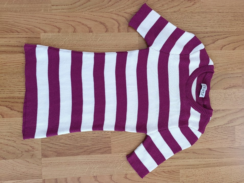 Uzun kollu, tekne yaka, mor beyaz çizgili triko hamile elbisesi, rahat ve renkli tasarımıyla günlük kullanıma uygundur.