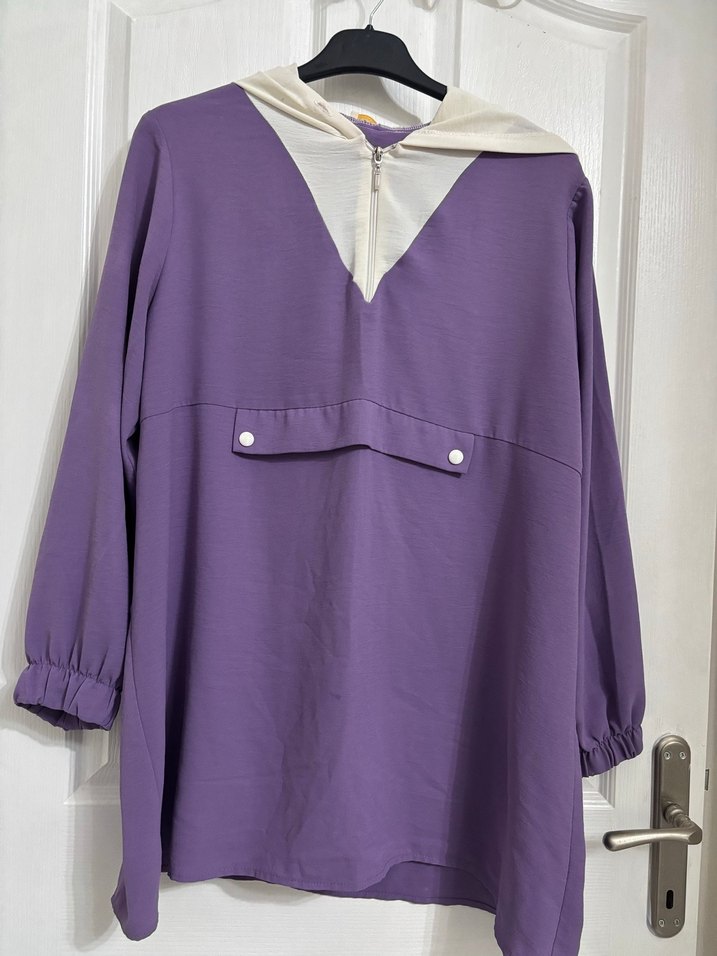 Mor renk, fermuarlı yakalı ve düğmeli detaylı uzun kollu bol kesim tunik. Yumuşak sentetik kumaştan, günlük rahat kullanıma uygun.