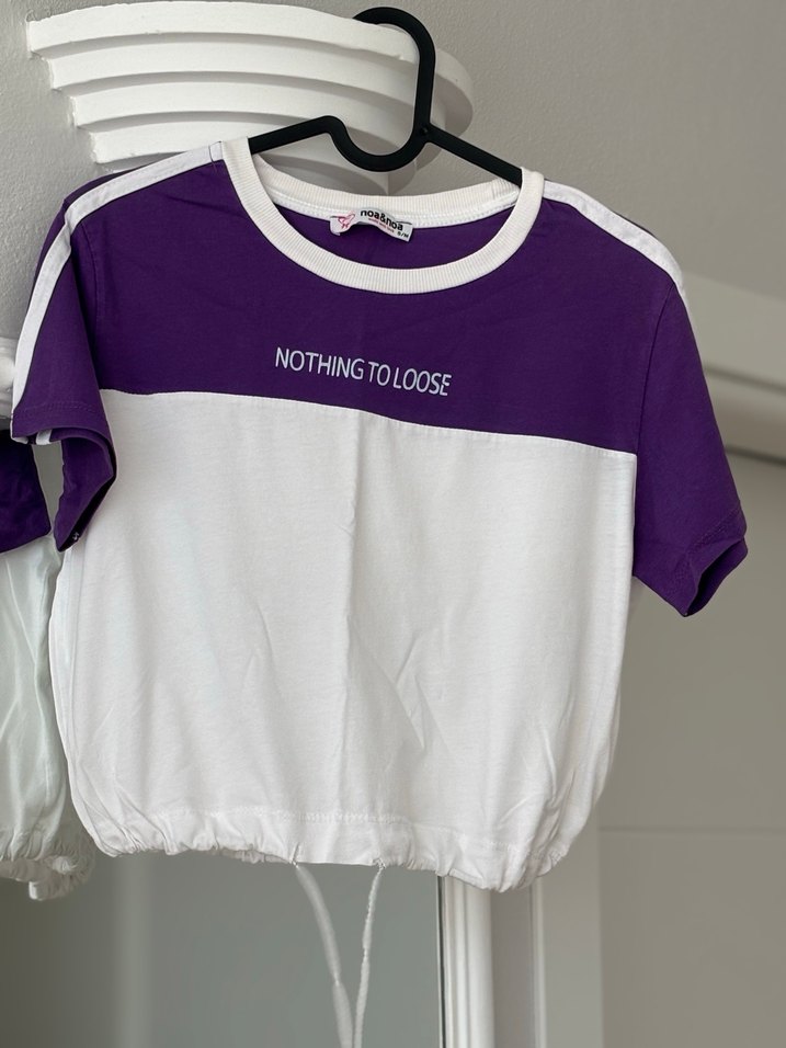 Mor ve beyaz renk bloklu, kısa kollu, yuvarlak yaka, pamuklu salaş kesim tişört. "NOTHINGTOLOOSE" baskılı, rahat ve şık görünümlü.