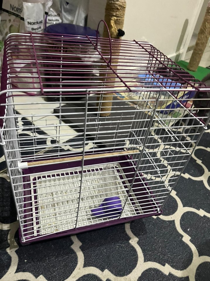 Mor beyazlı renkte küçük hayvan kafesi, sağlam tel çerçeve ve kolay temizlenen çıkarılabilir taban içerir. İçinde küçük mor bir sulugu bulunur. hıç kullanılmafı 29/35/22