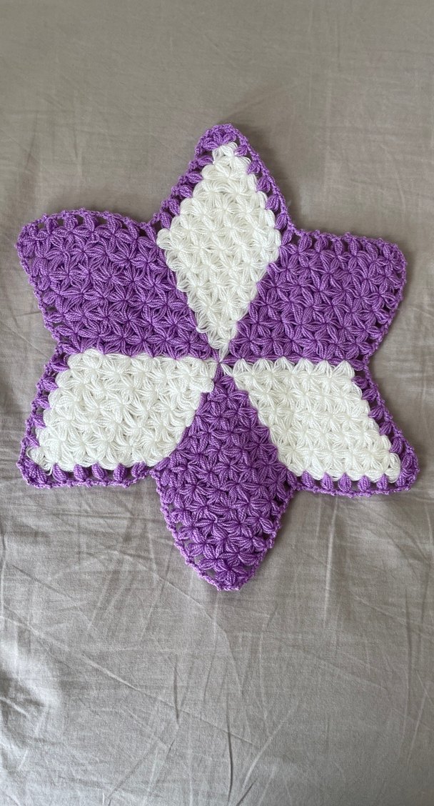 Mor ve beyaz renklerde, nakışlı örgü kumaştan yapılmış yıldız şeklinde banyo lifi.