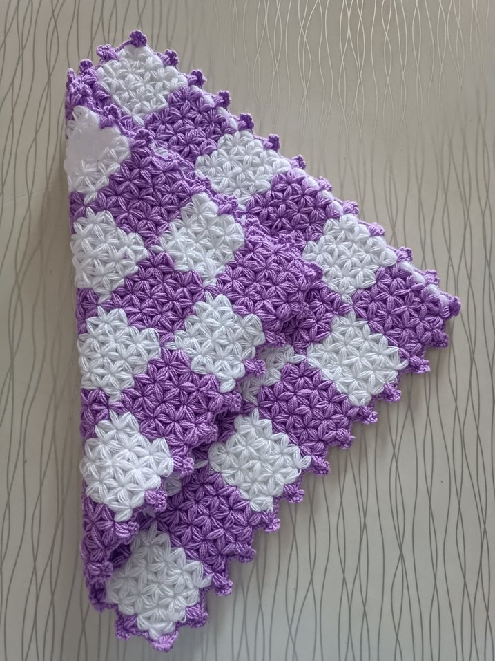 Pastel mor ve beyaz renklerde, dokulu örgü desene sahip yumuşak banyo süngeri.