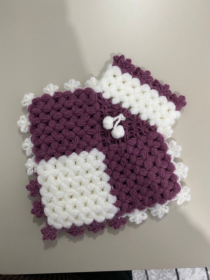 Mor ve beyaz renklerde, dokulu tasarıma ve süslemeli kenarlara sahip örgü banyo süngeri. El emeği