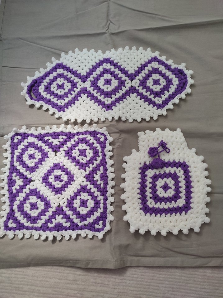 Mor ve beyaz renklerde, desenli örgü banyo süngerleri seti, banyo kullanımı için uygundur. El yapımı, sıfır ürün