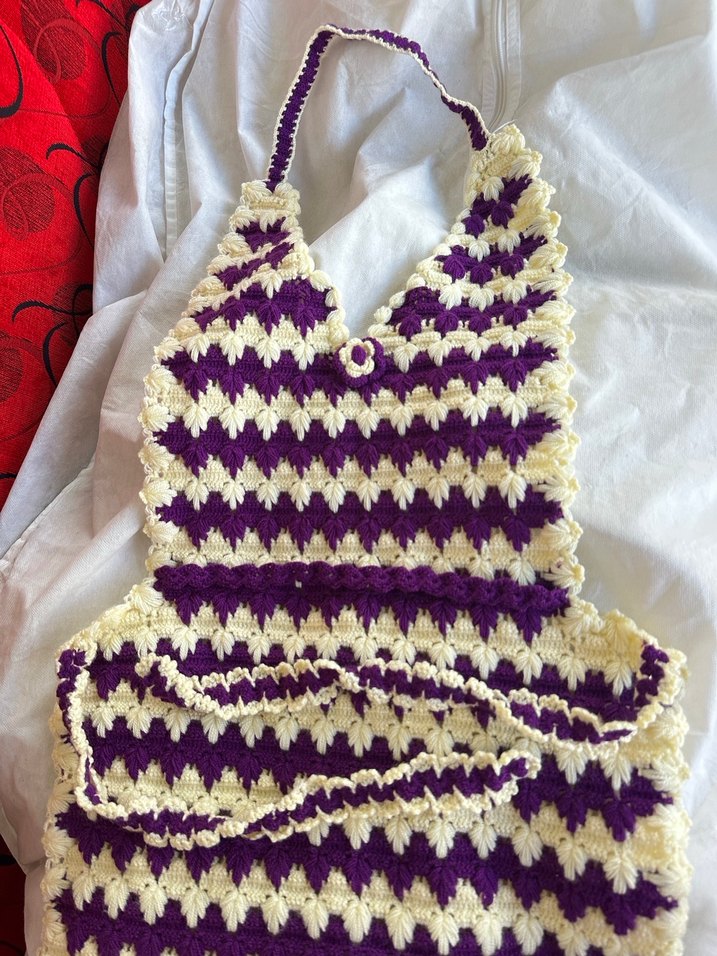 Mor ve beyaz renklerde örülmüş, düğme detayı ve askılı mutfak önlüğü. El emeği çeyizlik hiç kullanılmamış sıfır ürün