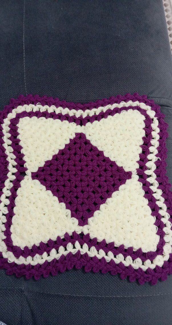 Mor ve beyaz renklerde renkli, tığ işi desenli yumuşak banyo süngeri.