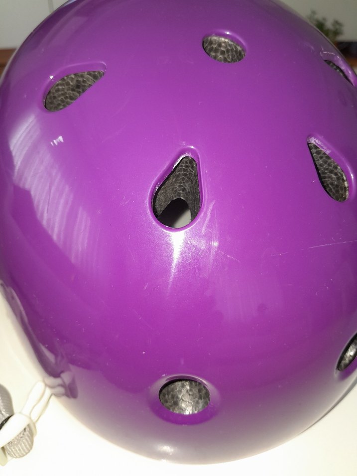 Mor renkli, delikli plastik kabuklu biker motosiklet kaskı. Güvenli tutuş için Velcro kayışlı, renkli ve desensiz tasarım. ️