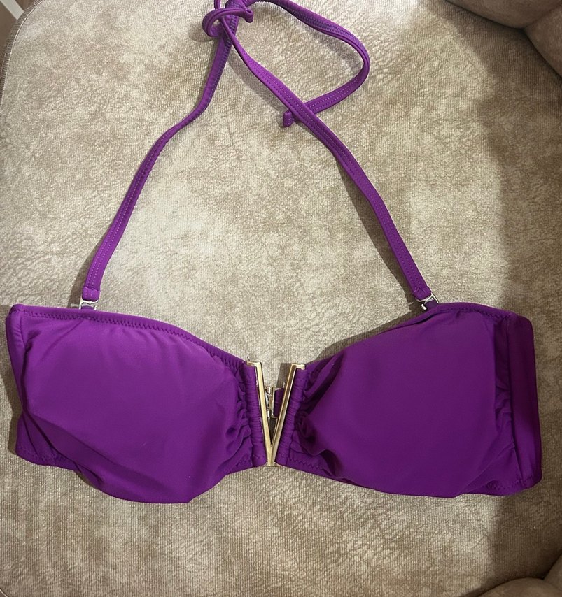 Rahat ve askılı tasarıma sahip mor, vücuda oturan bikini üstü, 85 b uygundur