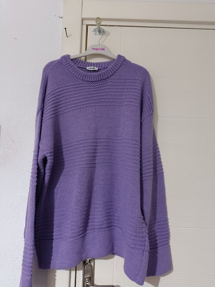 Pastel mor renkte, bisiklet yaka ve uzun kollu örgü kadın kazak. Rahat kesimi ve normal boyu günlük kullanıma uygundur. Kolları uzun