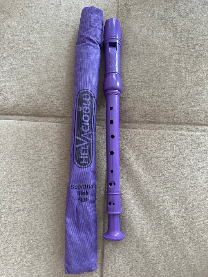 Canlı mor renkte, standart parmak deliklerine sahip sopran blok flüt ve uyumlu koruyucu kılıfı.