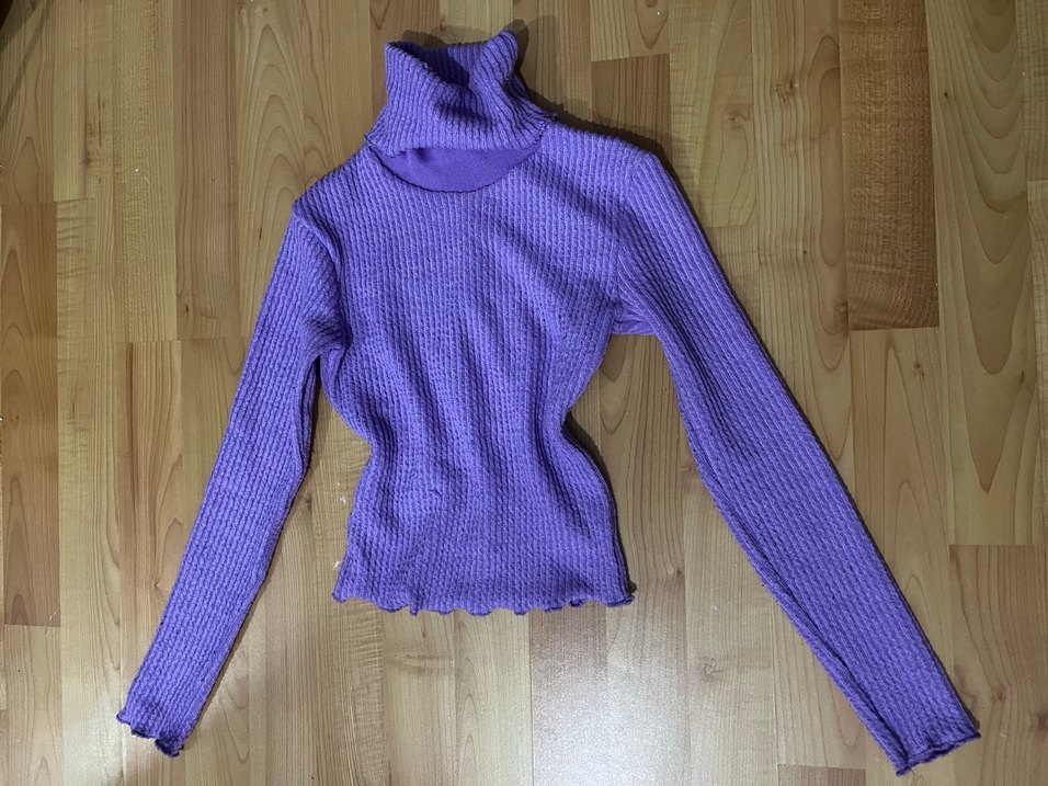 Mor renkli, bogazli ve uzun kollu, fit kesim kadın kazak. Normal boyda, örgü dokusuyla rahat ve şık bir günlük seçenek.