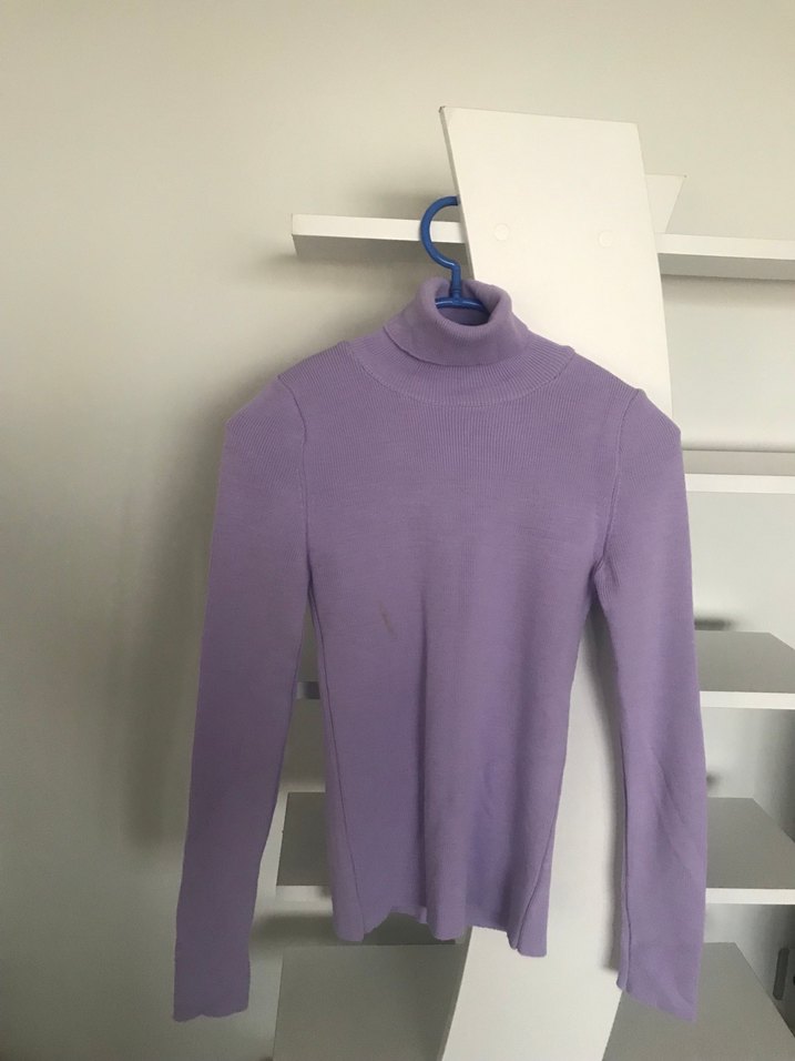 Pastel mor renkte, boğazlı ve uzun kollu, ince triko dokusuyla kadın kazak. Normal midi uzunlukta, minimal ve trend rahat tarzlara uygun. 36/38 bedene uygundur