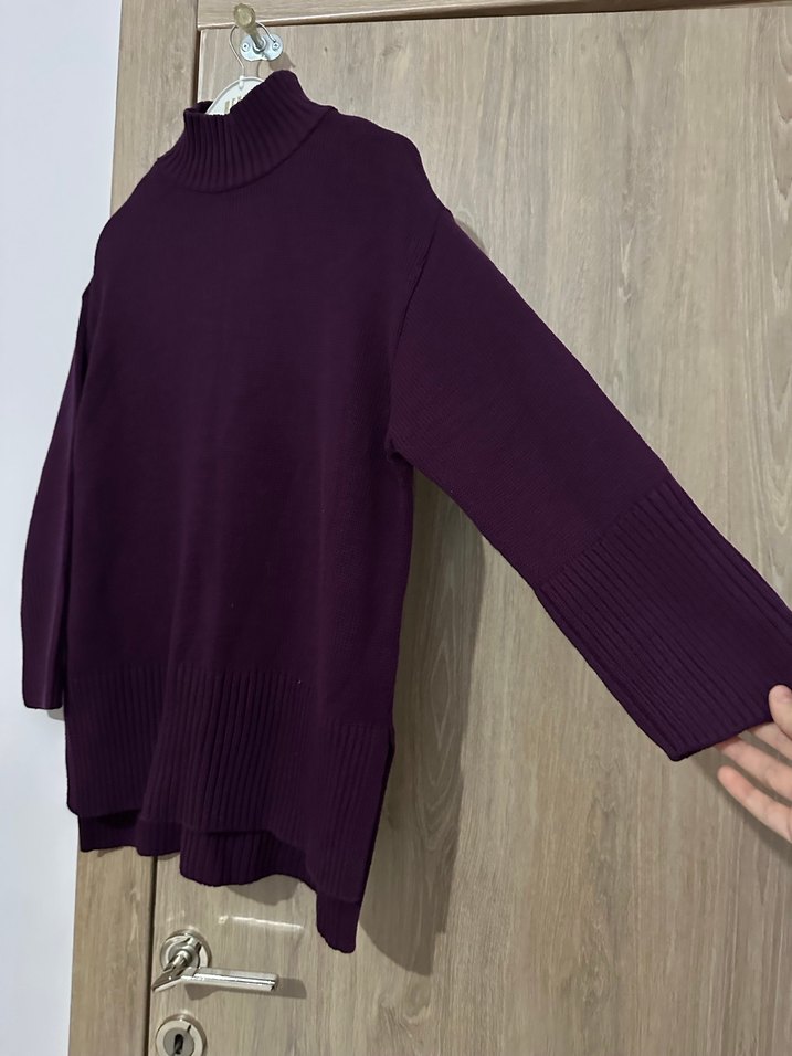 Mor renkli, boğazlı ve uzun kollu kadın kazak. Midi boy ve bol kesimiyle rahat, örgü kumaştan üretilmiştir. Günlük kullanıma uygundur.