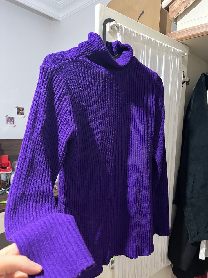 Mor renkte, boğazlı ve uzun kollu, örgü yapıda, normal midi boyda, dar kesim kadın kazak. Günlük kullanıma uygun, rahat ve şık görünümlü.
