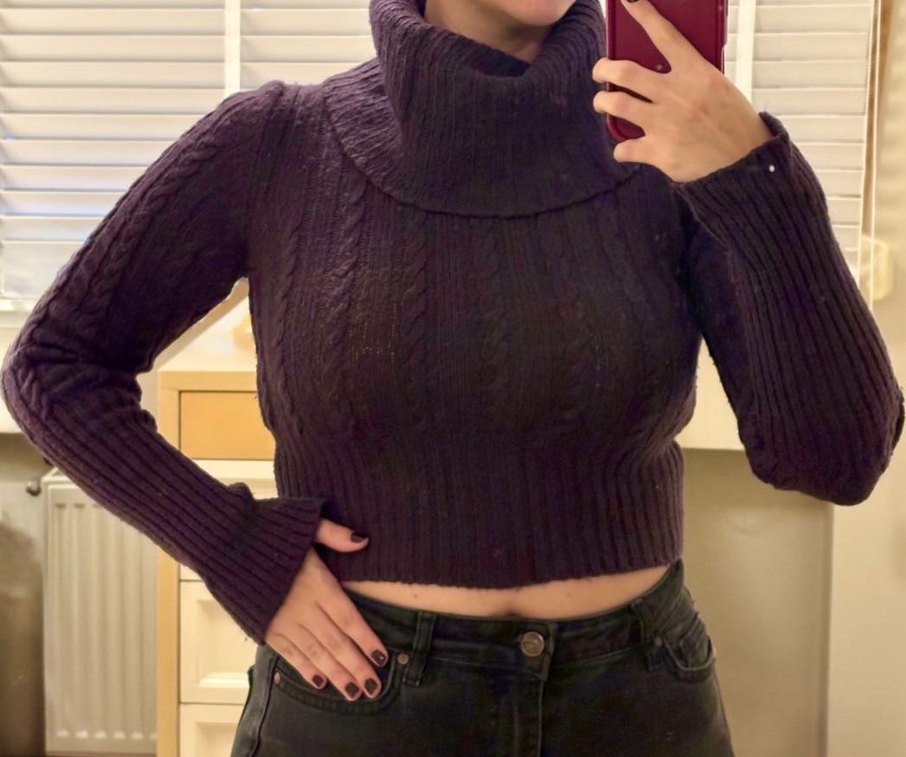 Bu mor, boğazlı ve uzun kollu örgü kazak, vücuda oturan kesimi ve midi uzunluğuyla rahat ve gotik tarzda tasarlanmıştır. Günlük kullanıma uygundur.