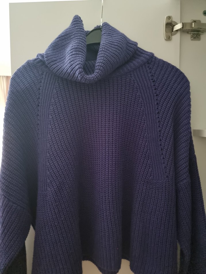 Mor renkli, boğazlı ve uzun kollu örgü kadın kazak. Rahat kesimi ve midi boy uzunluğu ile günlük kullanım için uygundur.