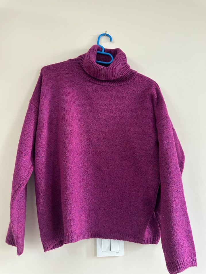 Mor boğazlı, uzun kollu, örgü yün kumaştan yapılmış, bol kesim ve normal uzunlukta kadın kazak.