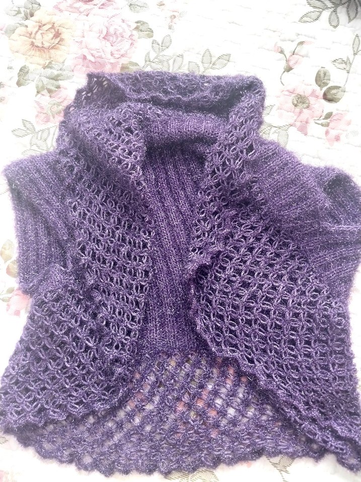 Parlak mor renkli, boğazlı ve kolsuz, ince örülmüş bohem tarzda kız bolero.