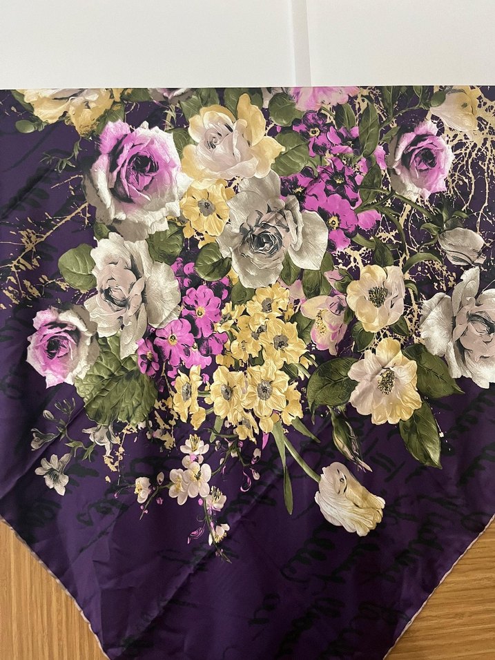 Mor renkte, koyu canlı çiçek desenli, dökümlü bohem stil kadın fular, yumuşak sentetik kumaştan yapılmıştır.