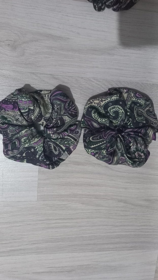 Yumuşak sentetik kumaştan, mor bohem desenli elastik saç tokaları.