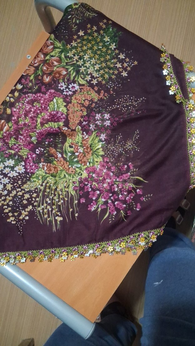 koyu Mor renginde, canlı çiçek desenleri ve ince işlemelerle süslenmiş bohem tarzda kadın şalı. dört tarafı oyalıdır Büyük boy.isteyene ölçülerini yazarım. hiç kullanılmadı.