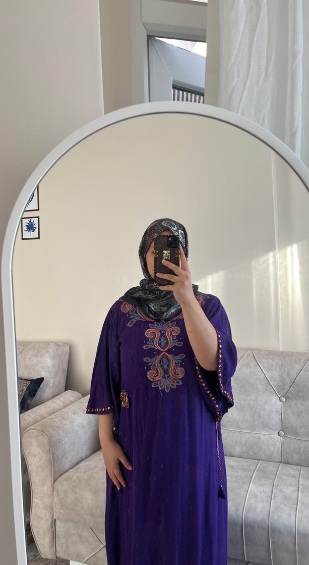 Mor renkte, yüksek yakalı, uzun kollu ve etnik desenli bohem tarzda salaş kesim henna elbise. Günlük kullanıma uygundur.