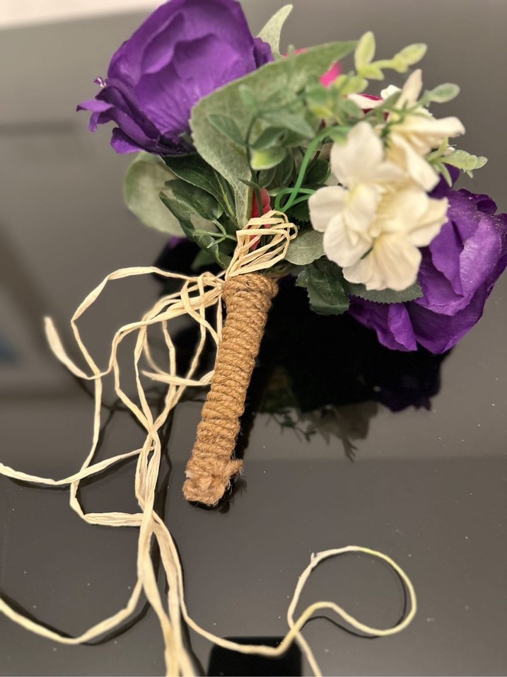 Gelin buketi sorunsuz Koyu mor ve beyaz çiçeklerden oluşan, doğal kurdele ve ip sarılı bohem tarzda gelin çiçeği.