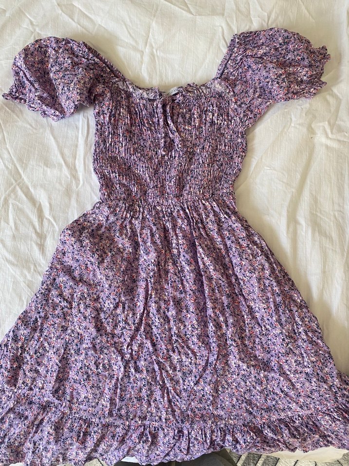 Mor renkli, kısa kollu ve fırfırlı detaylara sahip bol kesim mini elbise. Yumuşak sentetik kumaştan, pastel batik desenli ve straplez yakalı. Günlük bohem stil için uygun. ürün s bedenede uygundur kalıbı dar