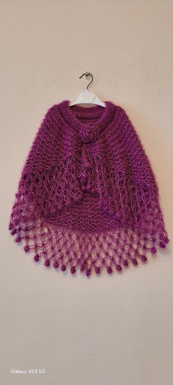 Mor renkli, örgü kumaştan yapılmış bohem tarzda, salaş kesim ve bisiklet yaka, askılı kollu kız çocuk pançosu. Desensiz ve renkli bir modeldir.
