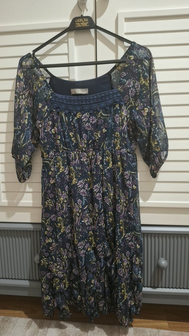 Mor renkli, bol kesim midi elbise, tekne yaka ve kısa kollu, çiçek desenli ve fırfırlı detaylarla romantik bir görünüm sağlar.