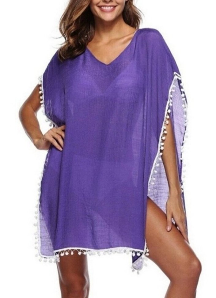 Hafif mor renkte, bol kesim ve drapeli kısa kollu, batik desenli, kenar süslemeli bohem midi pareo, plaj için uygun . Standart beden yeni-kutulu
