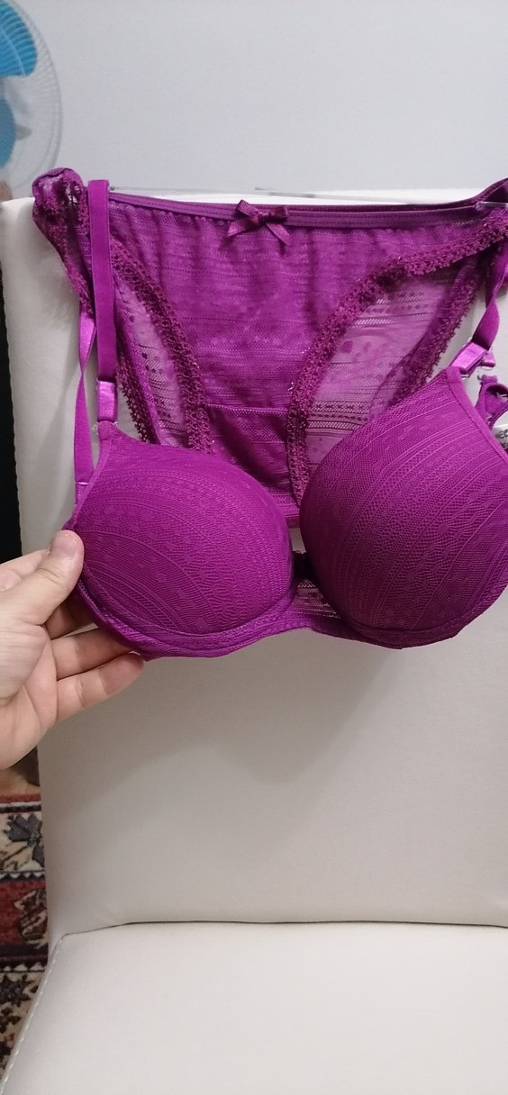 Koyu mor renkte, minimal bohem tarzda dantel detaylı sütyen ve midi külot takımı. Yumuşak ve rahat, doğal şekil verir. Marka temsili olup 80 bedendir