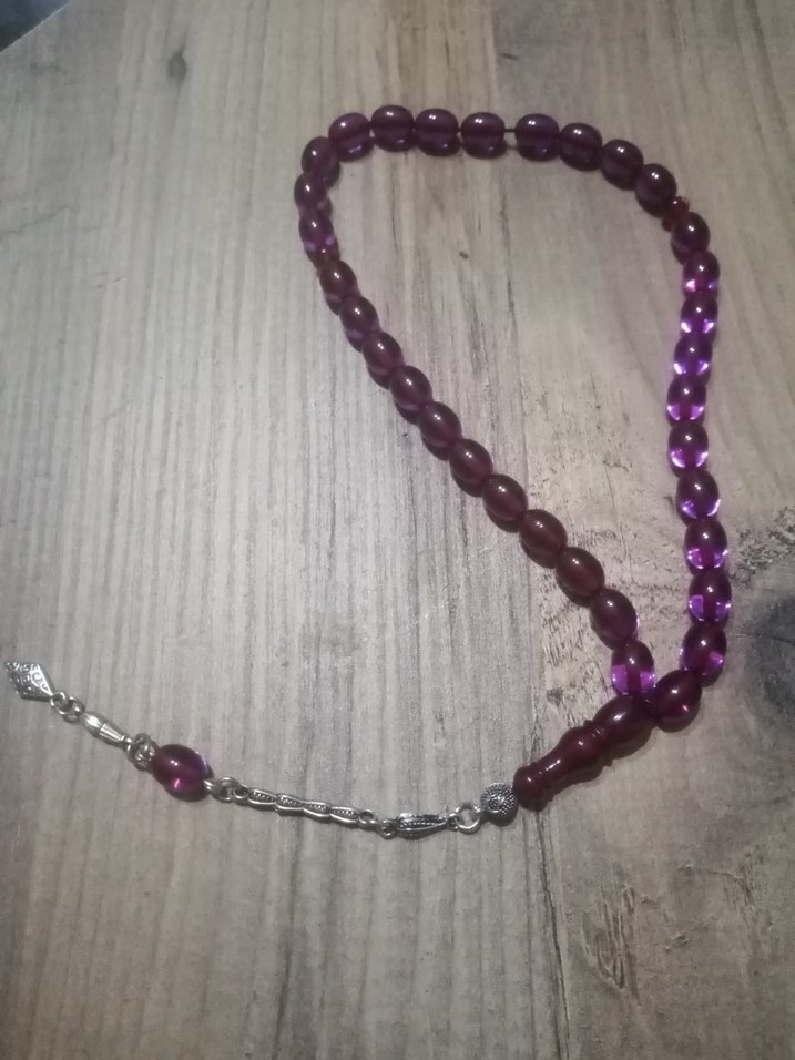 Koyu mor renkte, bohem ve minimalist tarzda tesbihi. Pürüzsüz yuvarlak boncuklar ve gümüş renk zincir detayı içerir.