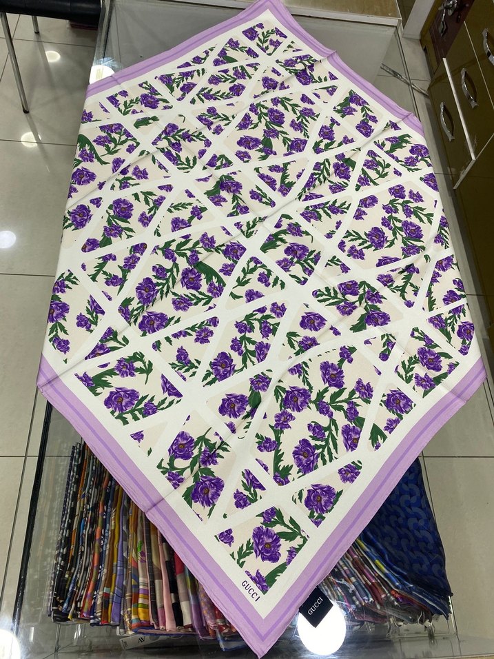 Hafif mor renkli, pileli, sentetik kumaştan yapılmış, vintage çiçek desenli bohem tarzı kadın fular.