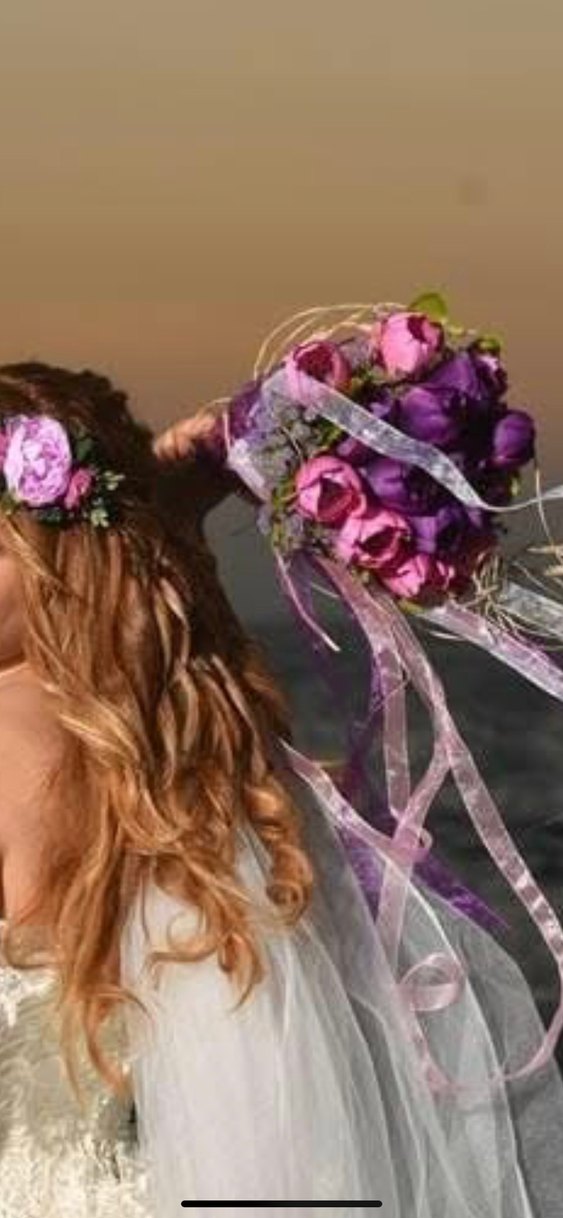 Mor pastel tonlarda, bohem tarzda, sarkan kurdelelerle süslenmiş gelin çiçeği