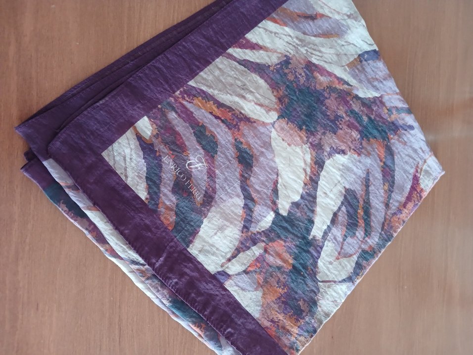 Kadın fular, mor renkli kenarları ve bohem desenleriyle yumuşak sentetik kumaştan drapeli tasarıma sahiptir.