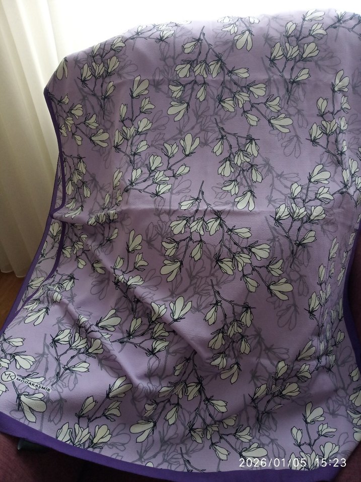 Yumuşak sentetik kumaştan mor, gri çiçek desenli, drapeli kadın şalı. Rahat bohem tarzıyla şık bir görünüm sağlar.