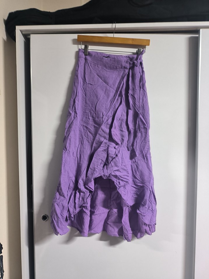 Mor renkte, keten kumaştan yapılmış, bol kesim ve drapeli uzun etek. Bohem tarz. düğme detayı ile bele oturtmalı ve bağlamalı etek hiç kullanilmadi
