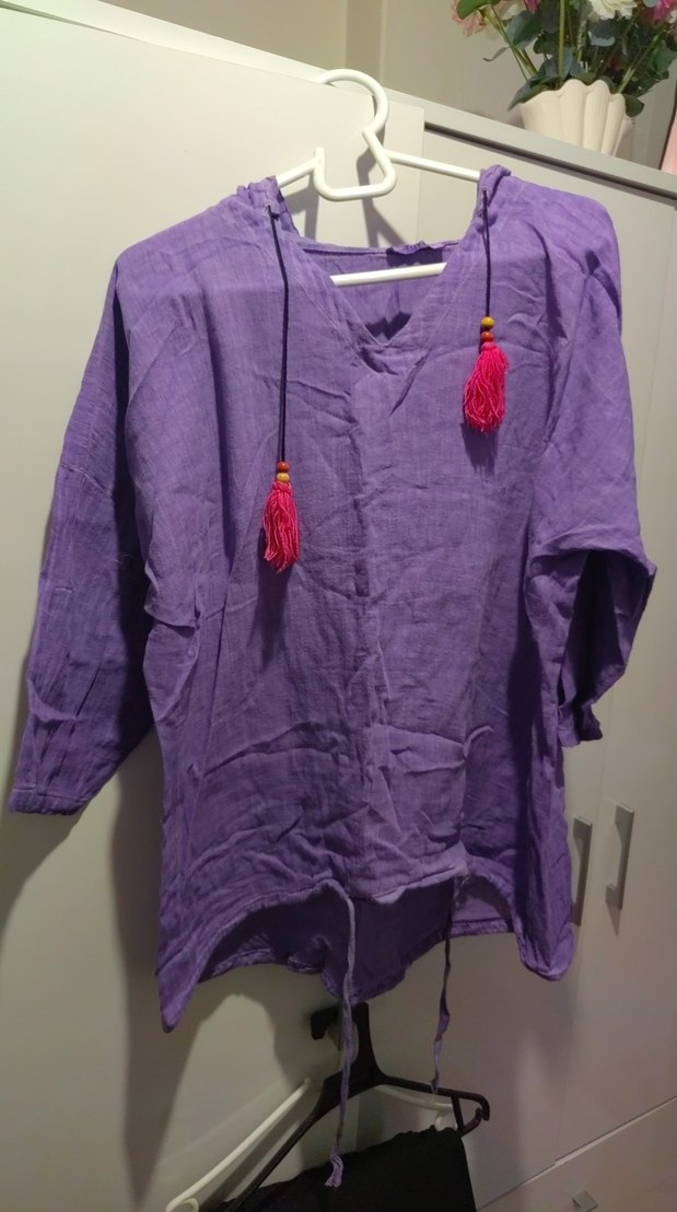 Mor keten kumaştan, uzun kollu ve V yakalı, püsküllü ve batik desenli bol kesim gömlek. Bohem tarz için uygun.