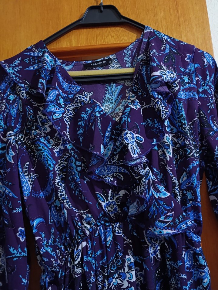 Mor renkte, uzun kollu elbise, salaş kesim ve V yakaya sahip. Bohem tarzda, dökümlü detaylı ve yumuşak sentetik kumaştan üretilmiştir.