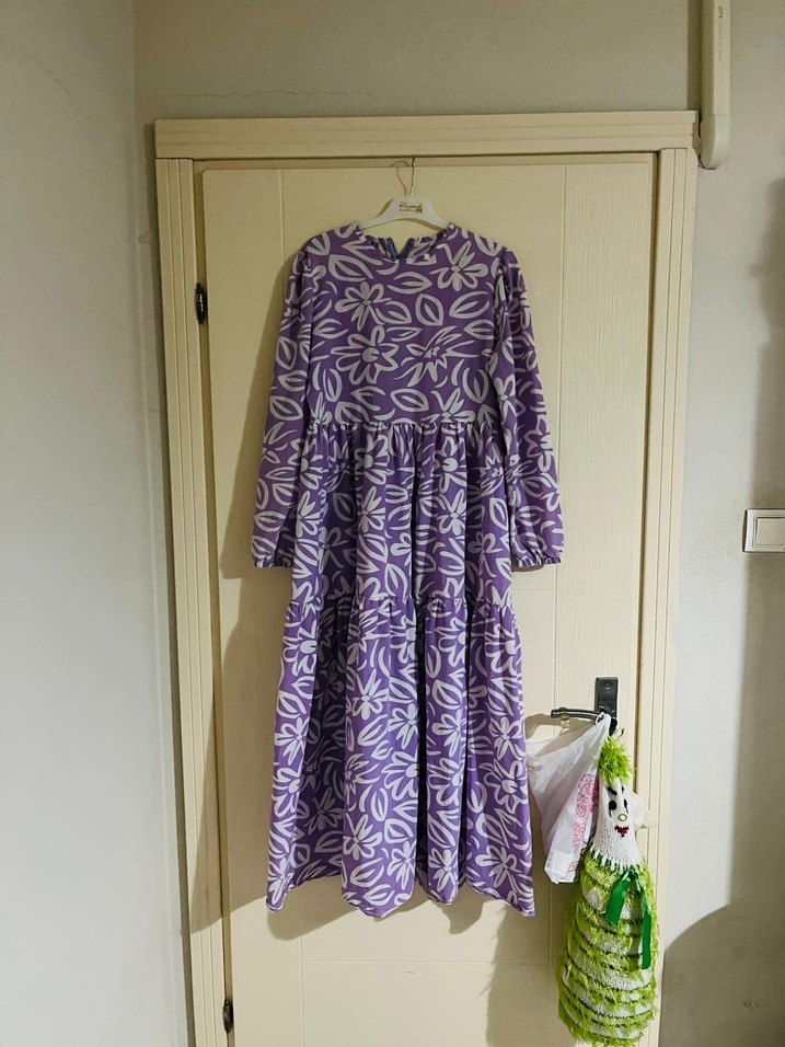 Mor renkli, uzun kollu, salaş kesim uzun elbise. Drapeli yapısı ve pastel tonlarda tie-dye çiçek desenleriyle bohem stilde bir model.