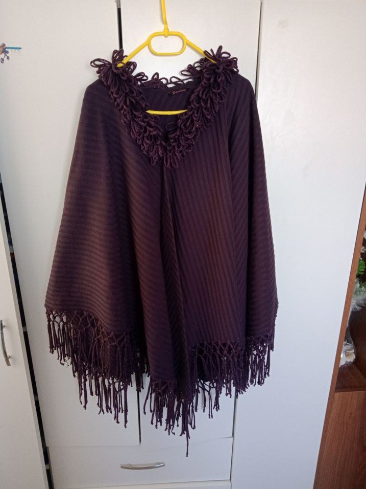 Mor renkli, uzun kollu, triko panço. Nakışlı detayları ve püskülleriyle bohem tarzda, rahat bir kesime sahip.