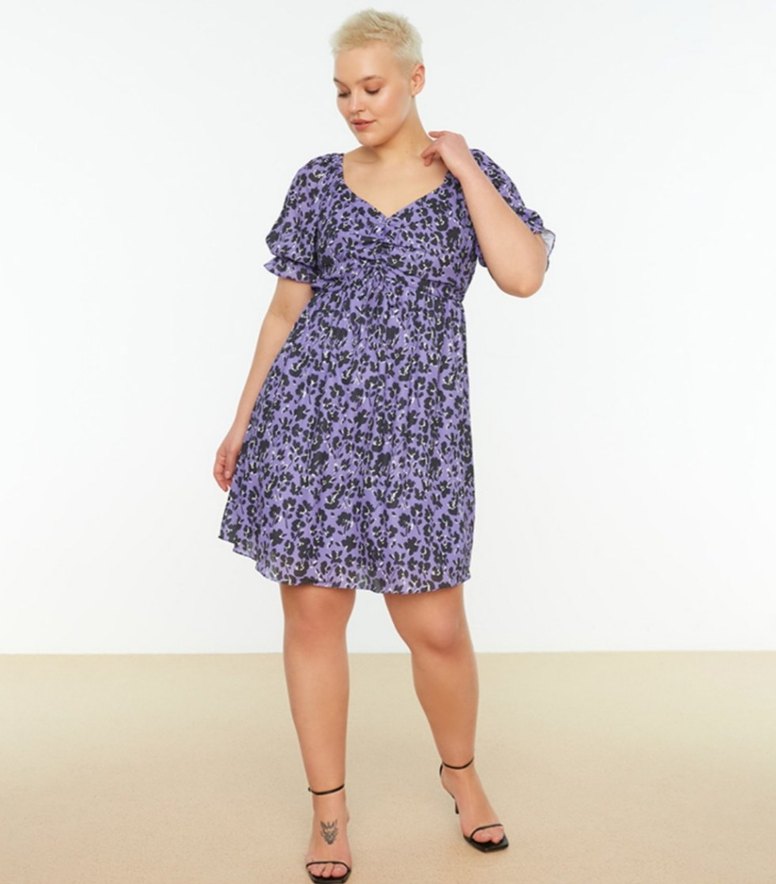 Mor bohem tarzda, bol kesim, kısa fırfırlı kollu, V yakalı midi elbise. Yumuşak sentetik kumaş üzerinde batik desenlidir, günlük kullanım için uygundur.